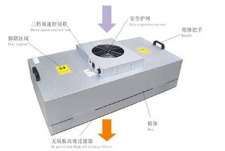FFU既是風機過濾單元的簡稱,它是一款自帶動力的過濾凈化裝置。主要是有風機和高效過濾器組合而成的末端凈化設備,其主要工作過程是:由空調處理機把空氣(新風)處理成所需要的狀態點后送入靜壓箱與回風混合,再經過FFU的風機加壓后經過高效過濾器(HEPA)或超高效空氣過濾器(ULPA)過濾后送入無塵室內;而原本的舊風則經過架空地板或者側墻輸送回到干盤管,在干盤管中經過冷(熱)處理后,再由回壓機送回到靜壓箱,這便完成整個無塵室空氣過濾的循環。這樣的系統最常應用在對無塵室有超靜需求的場所,例如制作大型集成電路晶圓、TFT顯示器、固態硬盤等等的無塵車間。這里優之凈跟大家講講FFU最主要的特點: