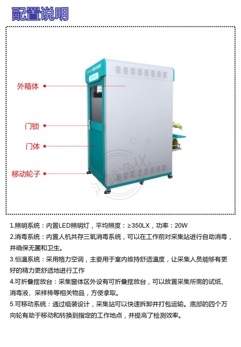 1.消毒系統:內置人機共存三氧消毒系統,可以在工作前對采集站進行自助消毒,
