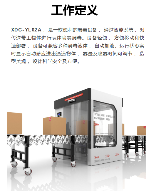 XDG- YL 02 A , 是一款便利的消毒設(shè)備, 通過智能系統(tǒng), 對傳送帶上物體進(jìn)行表體噴霧消毒。設(shè)備輕便, 方便移動和快速部署, 設(shè)備可兼容多種消毒液體, 自動加液、運行狀態(tài)實時顯示自動感應(yīng)進(jìn)出通道物體, 霧量及噴霧時間可調(diào)節(jié), 造型美觀, 設(shè)計科學(xué)安全及方便。