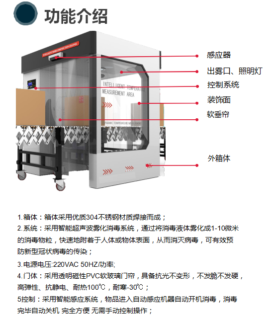 2. 系統(tǒng):采用智能超聲波霧化消毒系統(tǒng),通過將消毒液體霧化成1-10微米的消毒物粒,快速地附著于人體或物體表面,從而消滅病毒,可有效預(yù)防新型冠狀病毒的傳染;