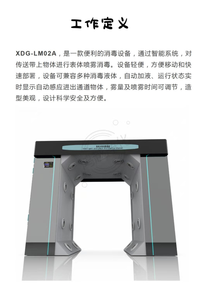 XDG-LM 02 A ,是一款便利的消毒設備,通過智能系統,對傳送帶上物體進行表體噴霧消毒。設備輕便,方便移動和快速部署,設備可兼容多種消毒液體,自動加液、運行狀態實時顯示自動感應進出通道物體,霧量及噴霧時間可調節,造型美觀,設計科學安全及方便。