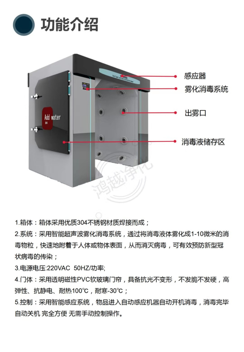 2. 系統:采用智能超聲波霧化消毒系統,通過將消毒液體霧化成1-10微米的消毒物粒,快速地附著于人體或物體表面,從而消滅病毒,可有效預防新型冠狀病毒的傳染;